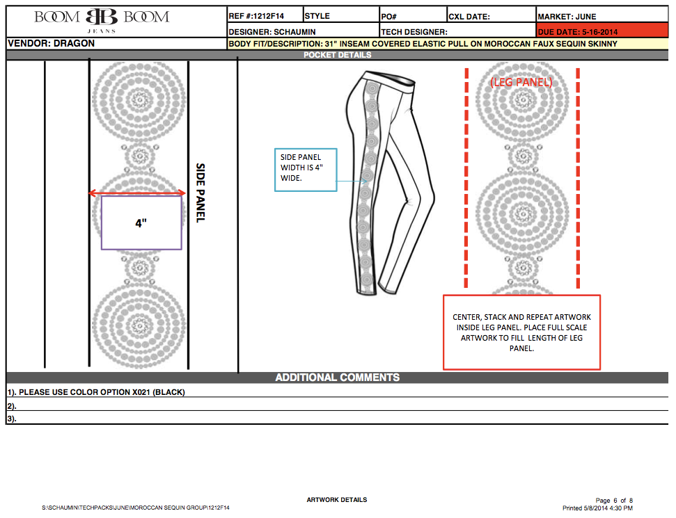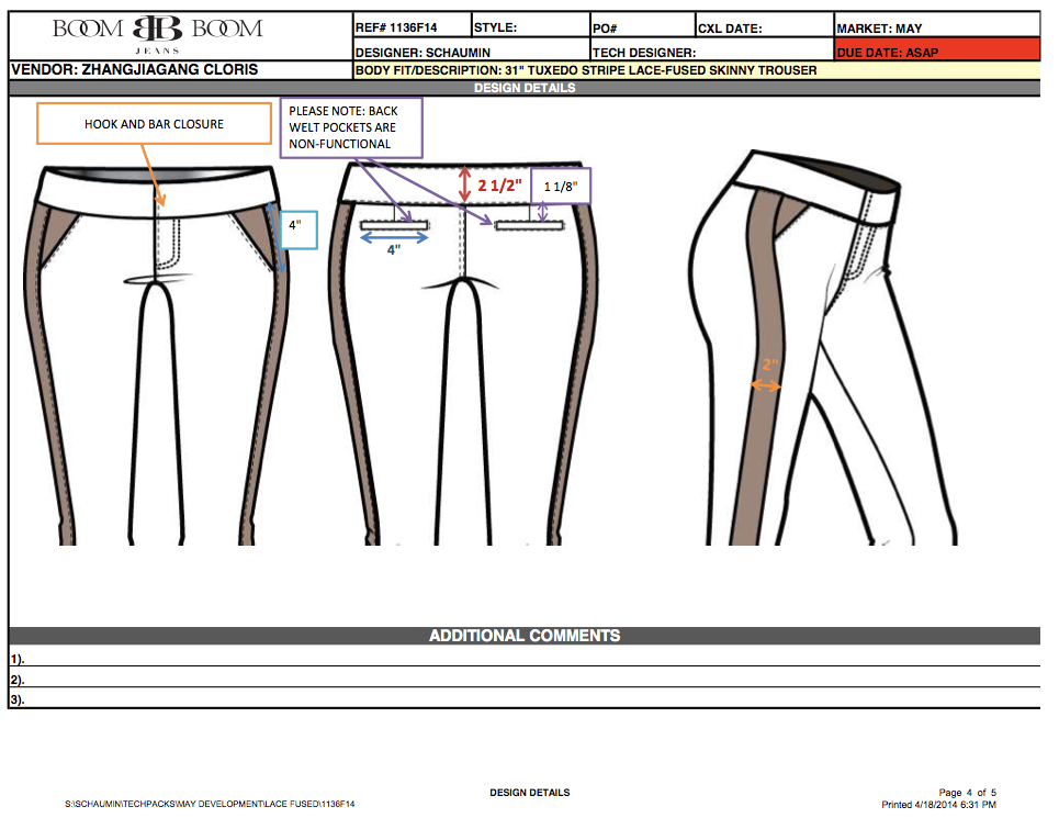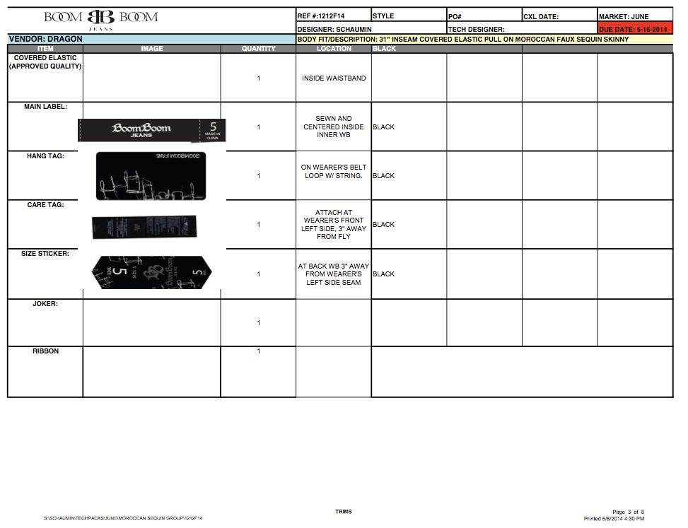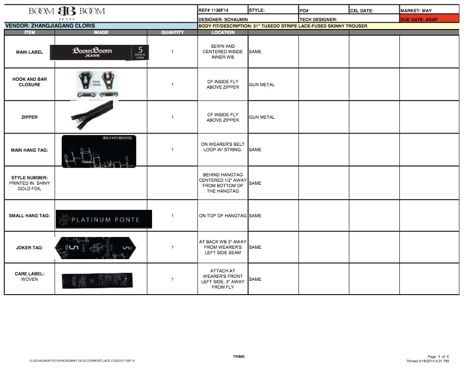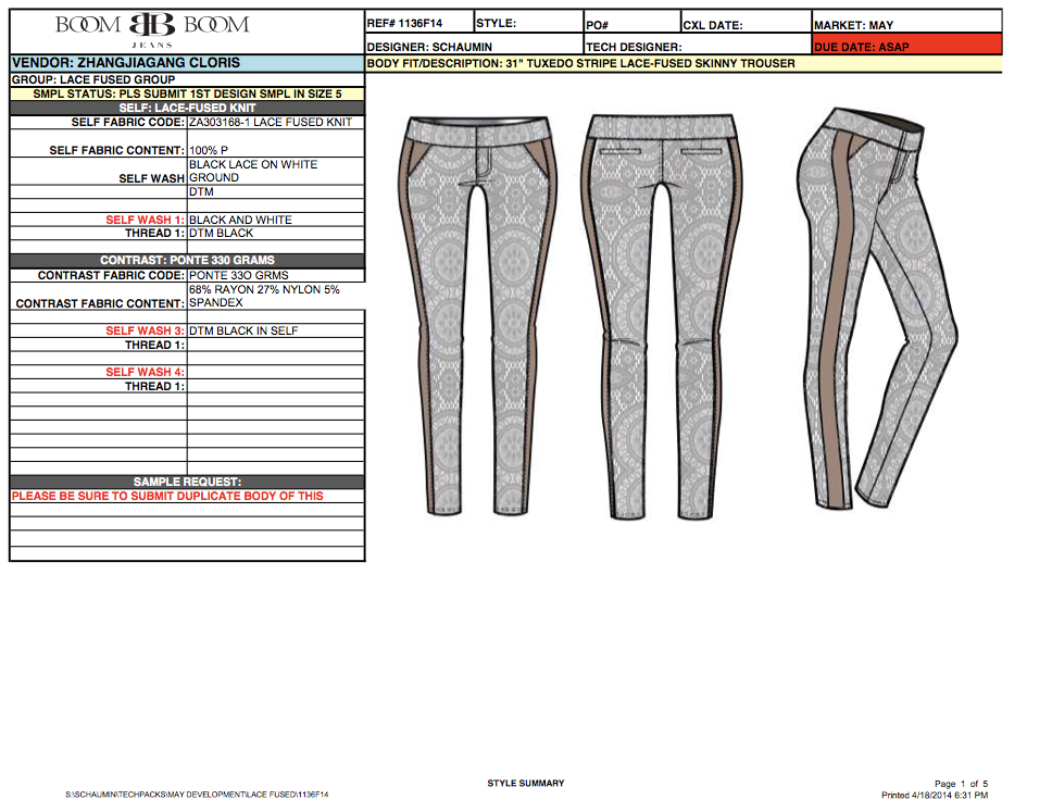 Technical Packages consisting of garment construction and trim specifications for accurate production.